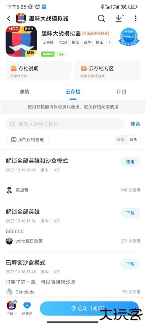 方法2:首先下载支持云存档的畅玩游戏,在畅玩游戏管理列表点击游戏图标进入游戏详情页面,在云存档tab选择存档并点击下载按钮,下载完成后点击“使用",使用存档并等待加载完成之后点击启动游戏,进入游戏即可体验存档。