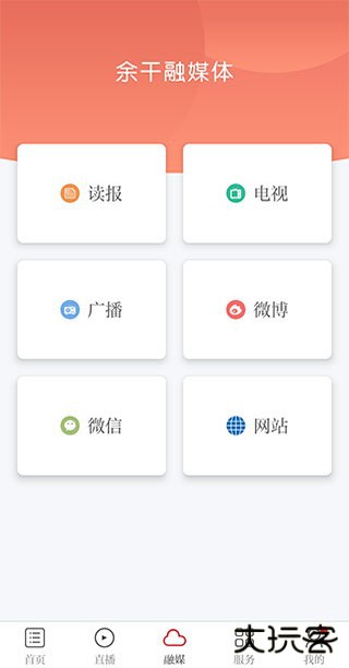 3、在【融媒】页面,余干融媒体已经为用户打造出了读报、电视、广播、微博、微信、网站这六大板块,用户可根据需要选择进入。