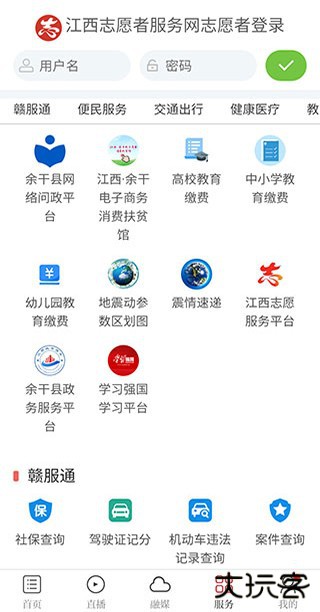 4、在【服务】页面,最上方是江西志愿者服务网志愿者登录入口,下面则是生活服务功能,涵盖了便民、交通、医疗等各个方面。