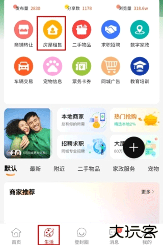 1、在生活页面中找到要删除的帖子的板块,小编就是分布了房屋租售的帖子