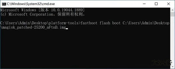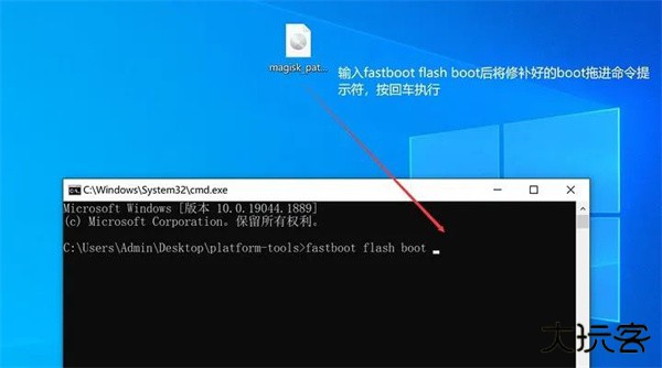 19.在电脑的命令提示符中输入fastboot flash boot 后将修补后的boot镜像拖入命令提示符