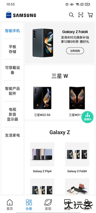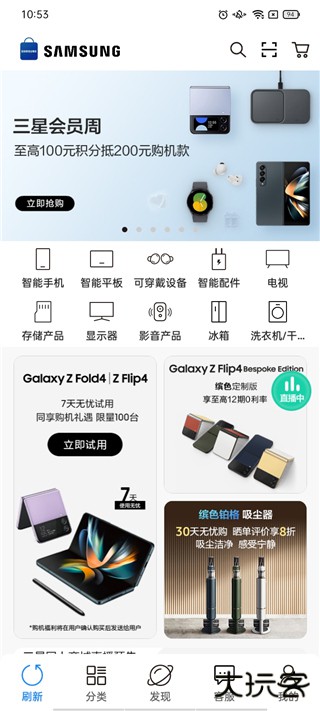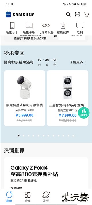 1、在首页中我们查看三星旗下各种智能设备,下方还有秒杀专区。