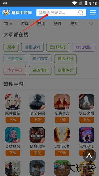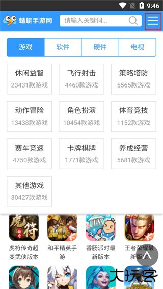 1、在乐玩网本站下载安装打开后在软件中点击右上角,在游戏、软件、硬件、电视四个大分类中,选择其个子的子分类。