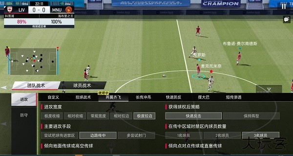 4、团队战术:玩家可通过「团队战术」自由制定球队的整体进攻与防守战术,完成场上的宏观战术调整,当然也可直接选择现有的成套战术,如:两翼齐飞;快速防反等,并且支持在现有成套战术上进行细节微调。