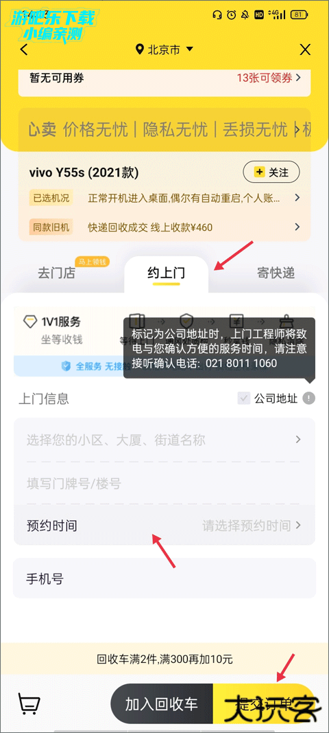 6、然后开始进行上门回收服务,有三种回收方式:去门店、约上门以及寄快递,点击约上门,输入上门信息以及预约时间,然后点击“提交订单”。