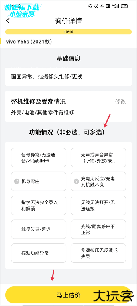 5、全部问题都询问清楚后,了解手机的基本信息、整机维修及受潮情况、功能情况就可以开始“马上估价”了。
