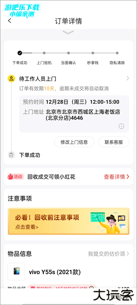 8、所有信息都填完就表示下单成功了,只要等待工作人员上门就可以了,如果你不想回收也可以取消订单,只要在工作人员上门之前取消即可。