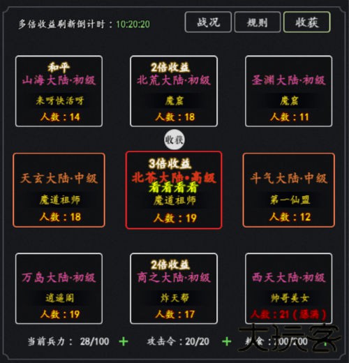 三、占领大陆当一个仙盟把同一大陆的非本盟的道友全部打出该大陆后,可以获得占领特权,本仙盟的所有道友收益都将提升20%。