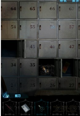 5、在房间的44号柜子里获得道具【剪刀】,另外在36号柜子里有【贴着符咒的女包】(暂时取不了),37里面有个贴着的符咒(这个可能是彩蛋还是什么,没有用到)