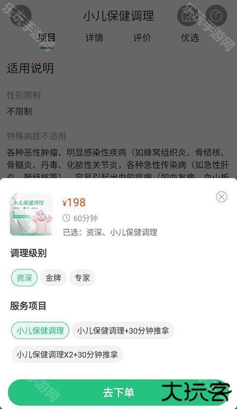2、选择好项目之后可以先查看一下适用说明,确保自己没有不适用的病症再下单。