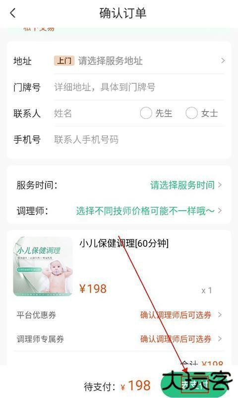 4、用户需要填写好信息,然后点击去支付即可,等待技师接单就可以享受医疗服务啦!