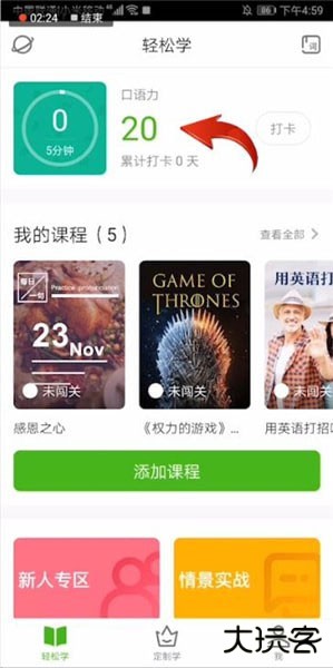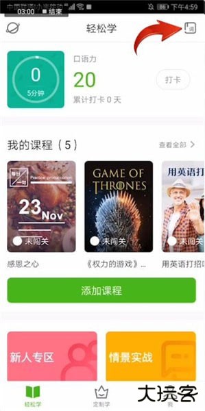 点击【轻松学】,完成每日打卡,提升口语力。下拉可看到必学课程、今日最热课程、今日朗读计划等。