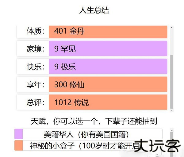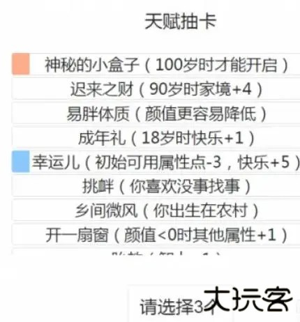 1、首先想要活得长,就需要开启修仙模式,我们只需要神秘小盒子和足够长的寿命活到100岁,开局天赋尽量选择体质、克苏鲁和美籍华人