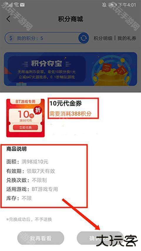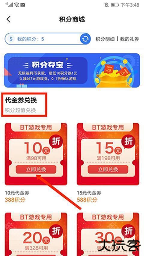 5、进入【积分商城】界面,在代金券兑换界面,选择需要的充值类型,这里以“10元代金券”为例,选择“立即兑换”选项,