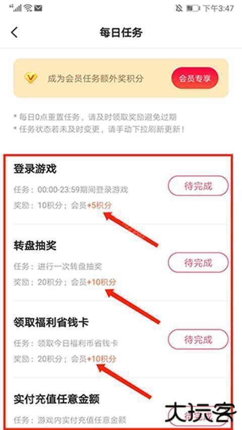 3、进入【每日任务】界面,每日签到和完成相应的任务即可获得积分,