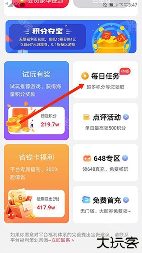 2、进入【福利中心】界面,往下滑动,选择“每日任务”选项,