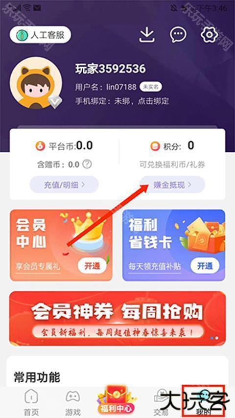 1、打开巴兔游戏app,在【我的】界面,选择积分栏目下的“赚金抵现”选项,