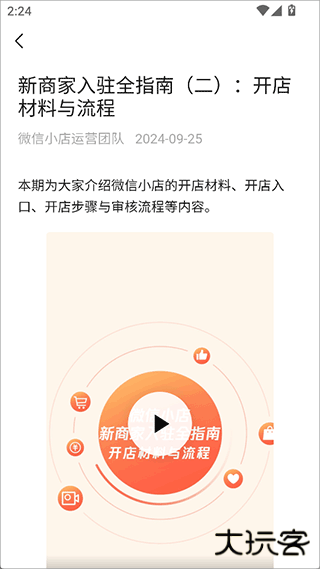 3、App内还有微信小店开通所需要的材料和流程、所经营的商品类目和品牌等都可以在上面以视频的形式查看。