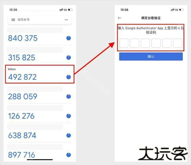 ②添加成功后,会显示6位数字及账号名 (6位数字即一次性谷歌验证码);将生成的验证码输入至Bibox开启谷歌页面,即可绑定成功。