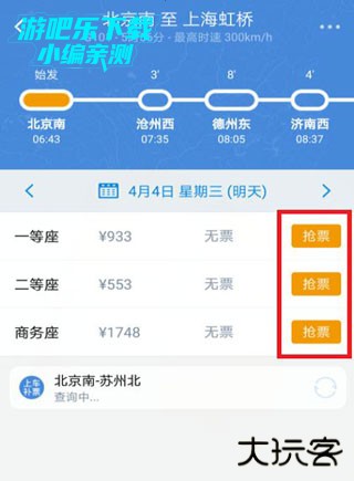 3、选定座等席后,点后方黄格中的“抢票”文字,即使直达的无票,您可以点蓝钮中的“上车补票”。