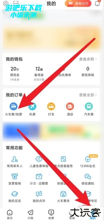 在个人中心,找到“我的订单”一栏,然后点击下面的“火车票/抢票”。