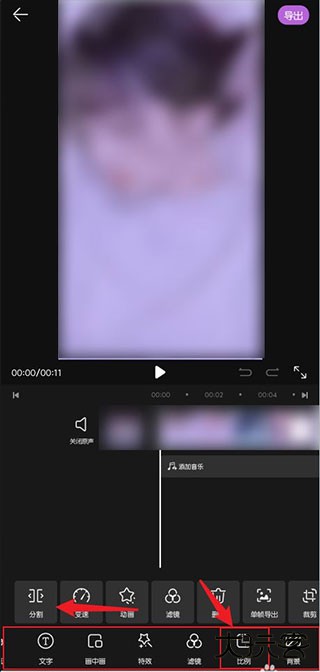 进入编辑界面后,向左滑动底部菜单,找到比例,点击进入,如图所示: