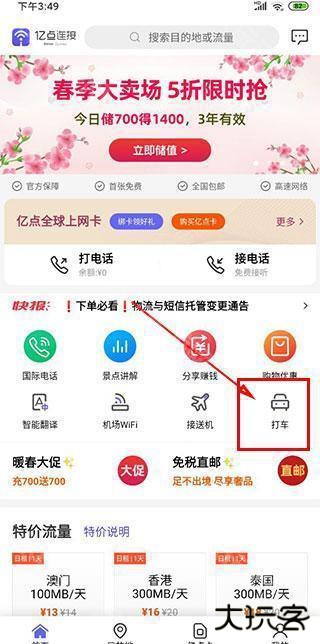1、进入亿点连接万能WiFi钥匙APP,点击打车;
