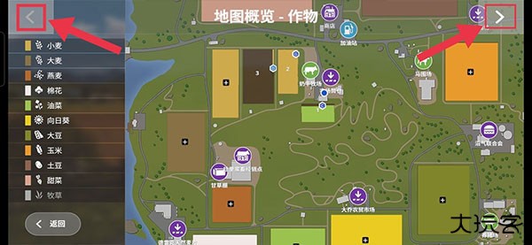 点开大地图我们可以掌握所有农田的状态以及不同农机所在的位置(后期农机数量多了以后靠切换车辆就比较浪费时间了,可以在地图上直接进入选定的载具),点击左右上角的符号切换你要查看的不同信息,包括:作物种类、生长状况、施肥情况、载具位置等。