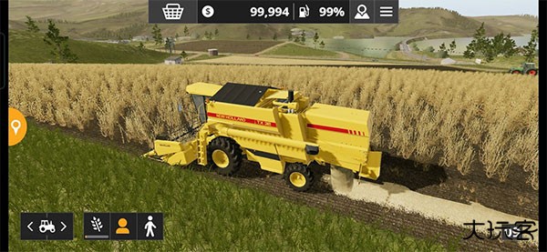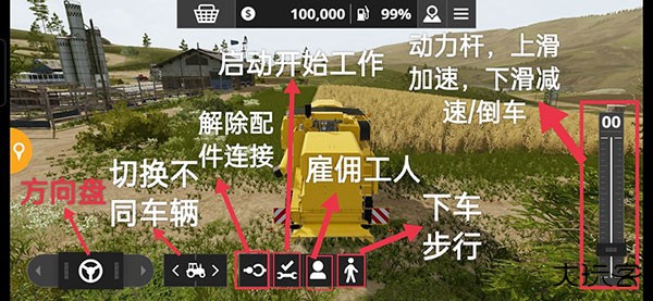 正式进入游戏,眼前就是我们的农场,首先接触到的内容就是“收割”,眼前已经有一片成熟的麦地,以及一台new holland纽荷兰收割机,具体各个图标含义见下图: