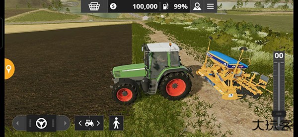 绿色拖拉机是芬特515c,后面有一台播种机,需要玩家自己挂接,操作非常简单,游戏里只需要倒车就可以自动连接了,这里是让玩家熟悉农机的接挂以及播种机的使用,除了部分高端播种机可以实现耕、播、施肥三合一,其他播种机只能在耕好的地上播种,像上面那块茬地,初级的播种机是无法直接作业的。