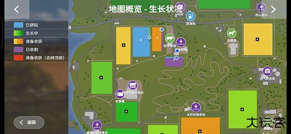 收割过的农田在地图上是紫色的,耕耘过以后就变成浅蓝色,施肥后的是深蓝色,播种后为绿色,变成黄色以后就代表已经成熟可以收割了。