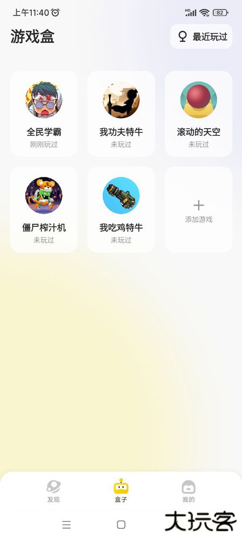 3、点开盒子,玩家可以查看你最近玩过的游戏,这里小编玩了全民学霸、我功夫特牛、滚动的天空等热门游戏