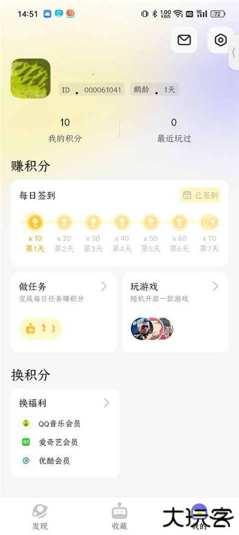 4、点击我的,大家还可以通过每日签到、做任务、玩游戏等方式来赚取积分哦