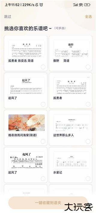 3、确定乐器后选择你喜欢的乐谱,右上角可以点击全选;