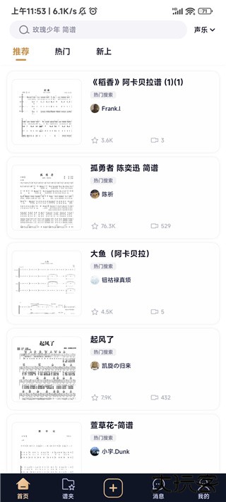4、进入首页,可以看到这里有推荐,热门和新上的乐谱;