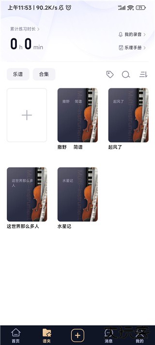 5、点击谱夹,这里能够看到你的练习时长和收藏的乐谱;
