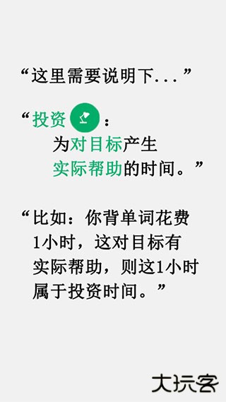 比如你背单词花费了一小时,对目标(英语考90分)有实际帮助,则这一小时算作是投资时间