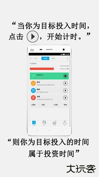 2、当你为目标投入时间时,点击记录按钮开始计时。那么这些就是你为目标投入的时间,是有效投资时间