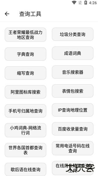 4、点开查询工具,可以查看王者荣耀最低战力地区、垃圾分类、字典查询、成语查询、缩写查询、表情包搜索等。