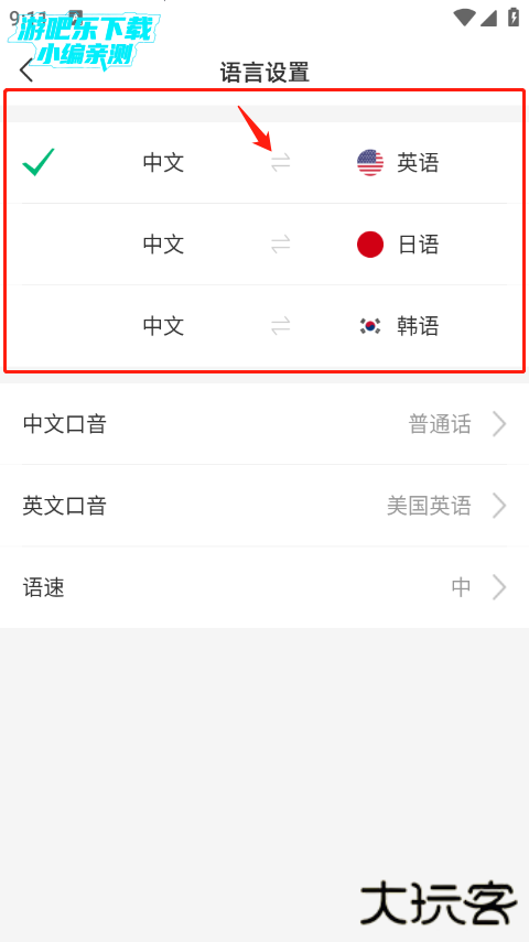 该应用软件可以切换成英语、日语、韩语和中文,这四种语言可以相互切换。还可以设置语音口语,可使用中文口音、美国英语,还可以调整语速。语言切换方法非常简单,如下: