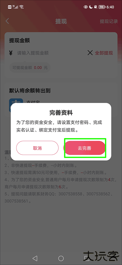 4、不过因为实名制的缘故,用户需要在这里点击“去完善”选项进行支付密码的设置、实名认证和绑定支付宝的授权后才可以正常使用;