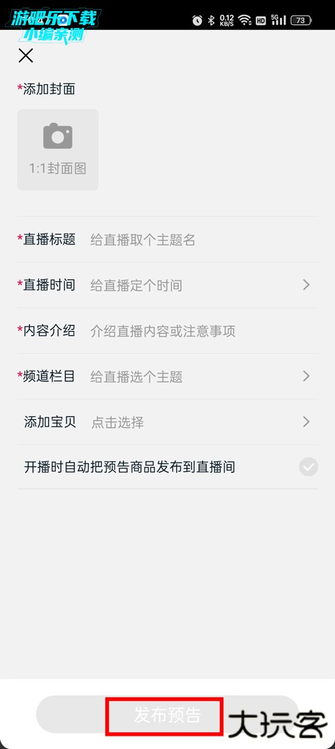 4、在直播预告中,添加封面进行内容介绍,添加商品宝贝,最重要的是选择自动把预告商品发布到直播间,最后点击发布预告即可。