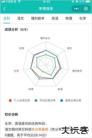 直观的显示出个人的得分率与整体的对比情况,并根据个人的成绩初步诊断学生的各科情况: