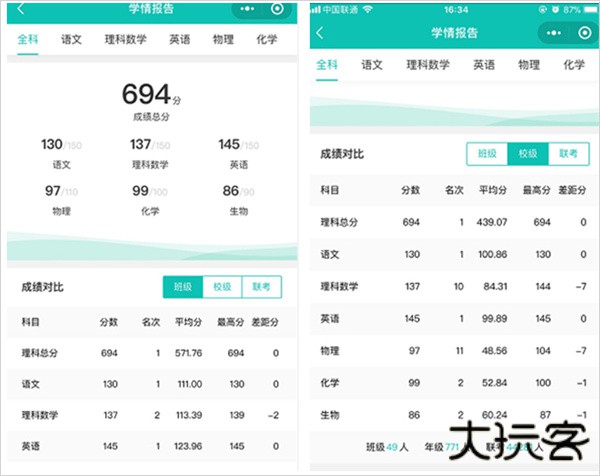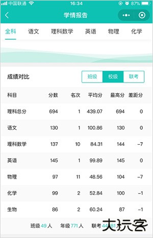 个人成绩与班级/学校的对比情况(如果是参加联考会有各校的对比选项)。