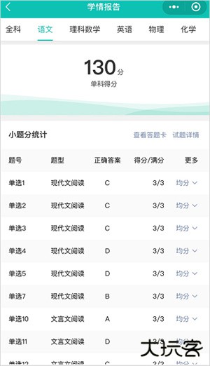 各科各题的得分情况,点击均分可查看该题的班级、年级、联考的均分对比情况,点击查看答题卡可查看本人的答题卡图片情况。