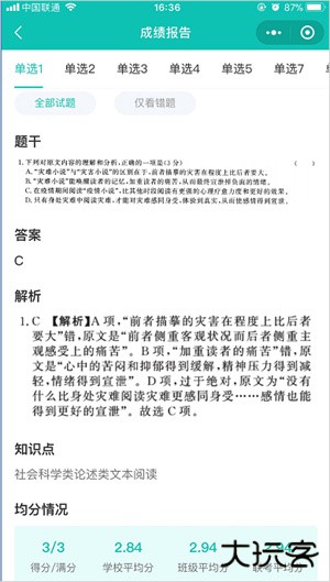 展示各科各题的题干、答案、解析、知识点、均分情况;支持查看全部试题和仅看错题。