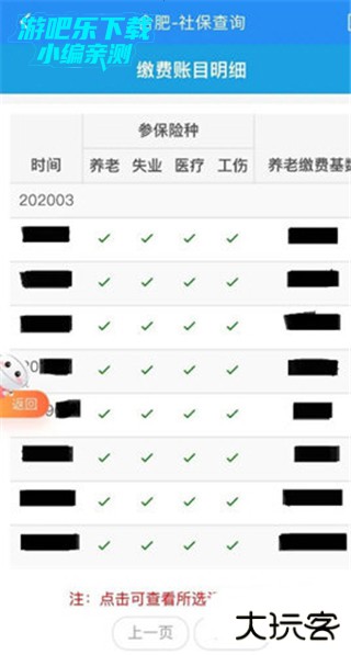 3、点击【缴费项目明细】,会显示相应的缴费账目明细,包括时间、参保险种、养老缴费基数