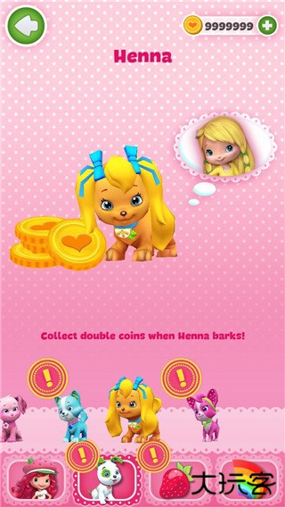 4、Wenna,黄色的小狗,解锁需要花费3950的金币,另外跟它对应的公主是黄色衣服和头发的公主,效果和之前的小狗一样也是让金币加倍。