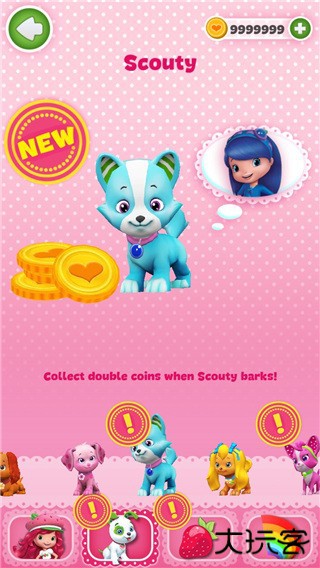 3、Scouty,蓝色的小狗,解锁需要3450的金币,和它对应的公主同样也是蓝色衣服和头发的,在一起的时候同样也是能够让我们的所得金币双倍。