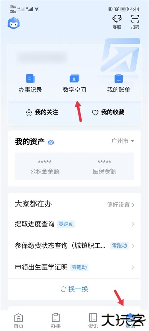 1、进入到软件之后点击我的页面,找到数字空间进入。